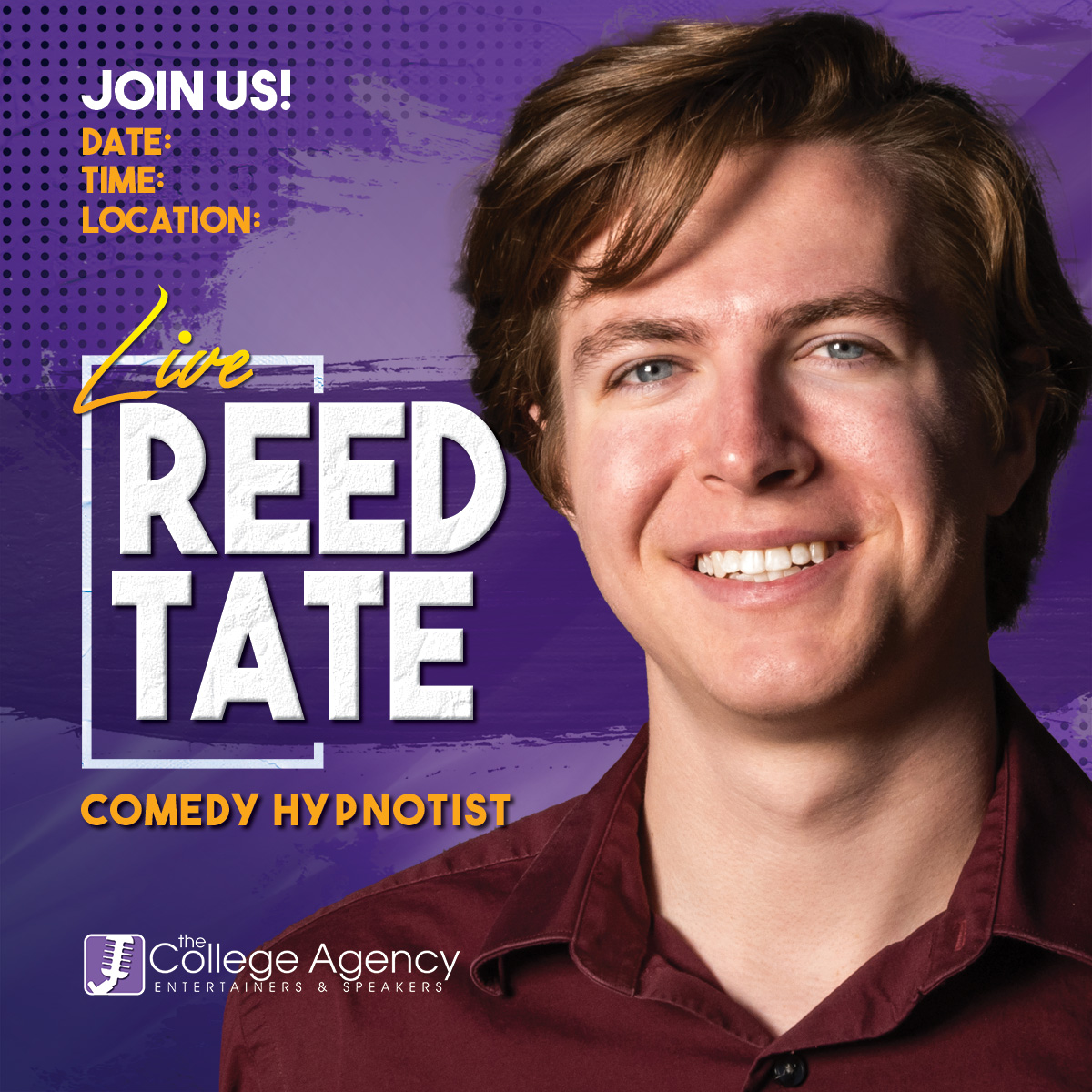Reed is one of the youngest entertainers in the business. Starting off performing magic as a kid, Reed Tate taught himself hypnosis at the age of 16 after he saw his first hypnosis show. He has since then gone through trainings and mentorships to sharpen and build the hypnotic knowledge he possesses today. He spent his time in the spotlight with musical and performing groups in his high school and college years. Now he spends his time with street hypnosis, educational demonstrations, and countless hypnosis shows from coast to coast. Reed aims to use a style that is exciting, refreshing, and suitable for all forms of audiences to enjoy. He brings his high energy, professional image, and loads of entertainment to any show he does. Every show is never the same and is nonetheless memorable as he caters the performance to that of the audience. No matter the venue, Reed will leave your audience thrilled and wanting more.