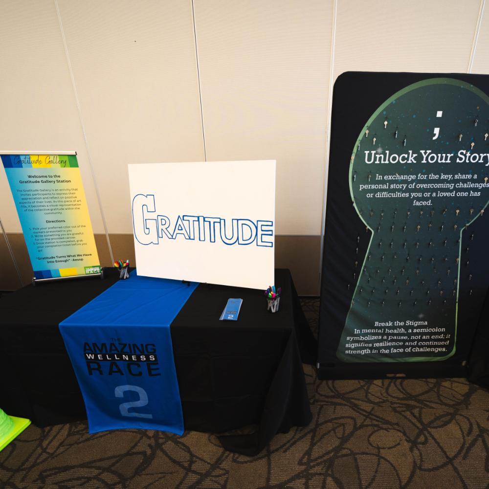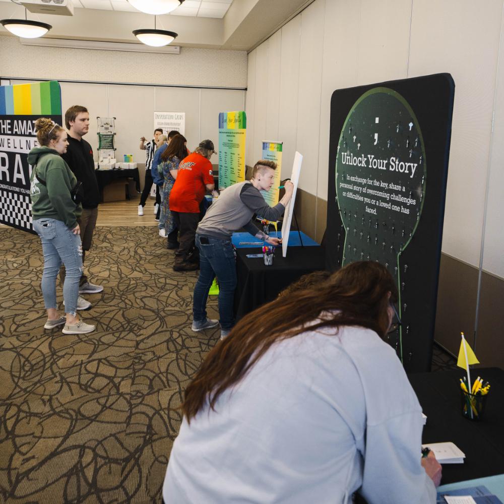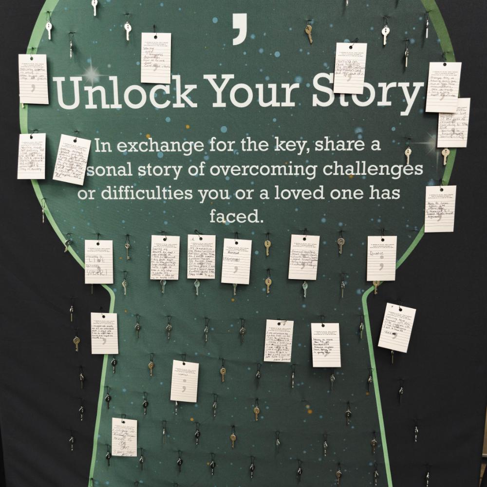 The Unlock Your Story Station is a transformative activity that invites individuals to share their personal stories of overcoming challenges. In exchange for their story, participants receive a key with a semicolon symbol, which they can turn into a keychain. This symbolic gesture not only serves as a reminder of their resilience, but also helps raise awareness for mental health stigmas. Through this activity, students learn the profound impact of vulnerability, empathy, and connection. By sharing stories, participants discover that they are not alone, and that their experiences have the power to inspire and support others. This activity underscores the importance of seeking help, offering support, and breaking the silence surrounding mental health issues. It empowers students to create a supportive community where everyone feels seen, heard, and valued.
